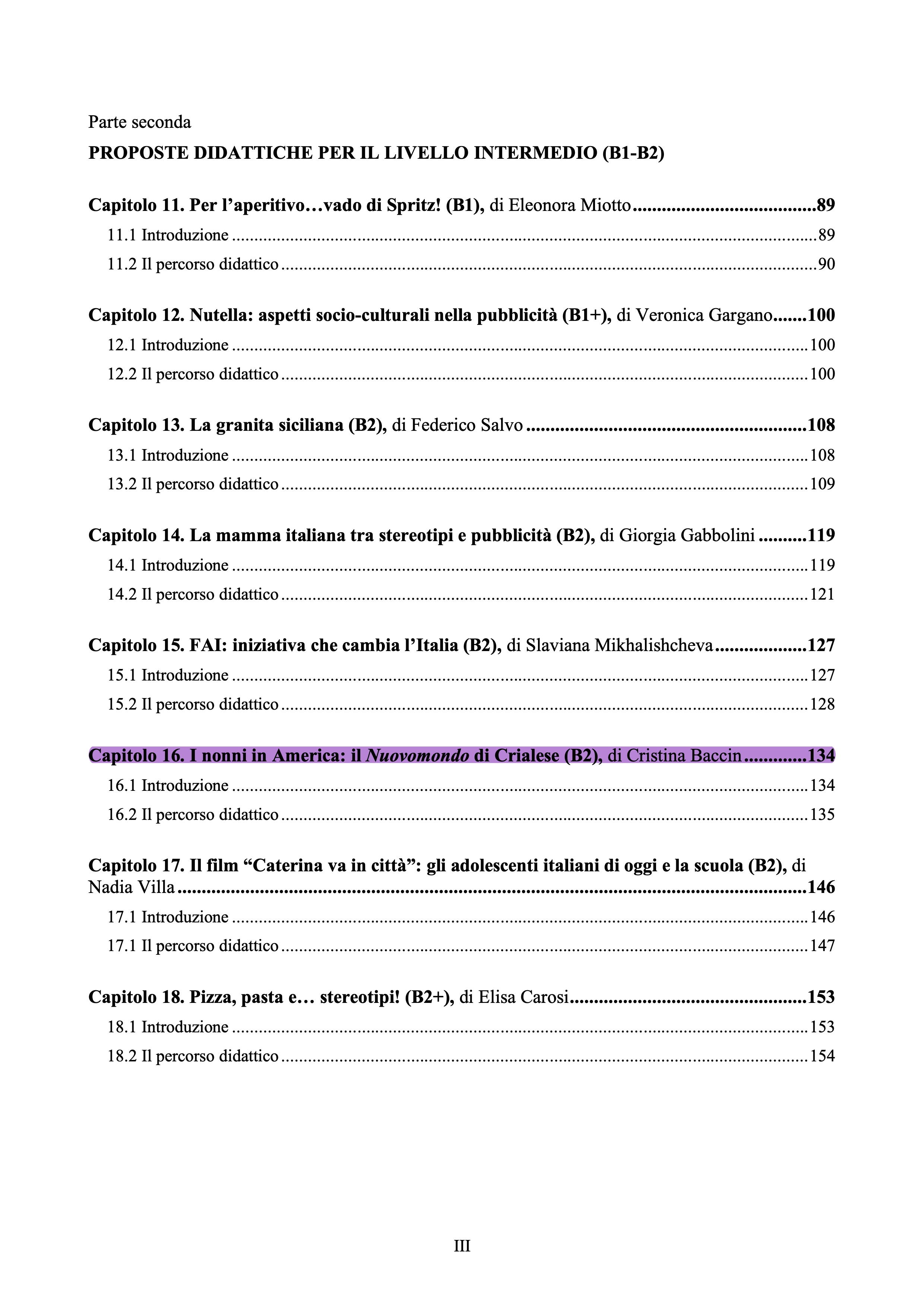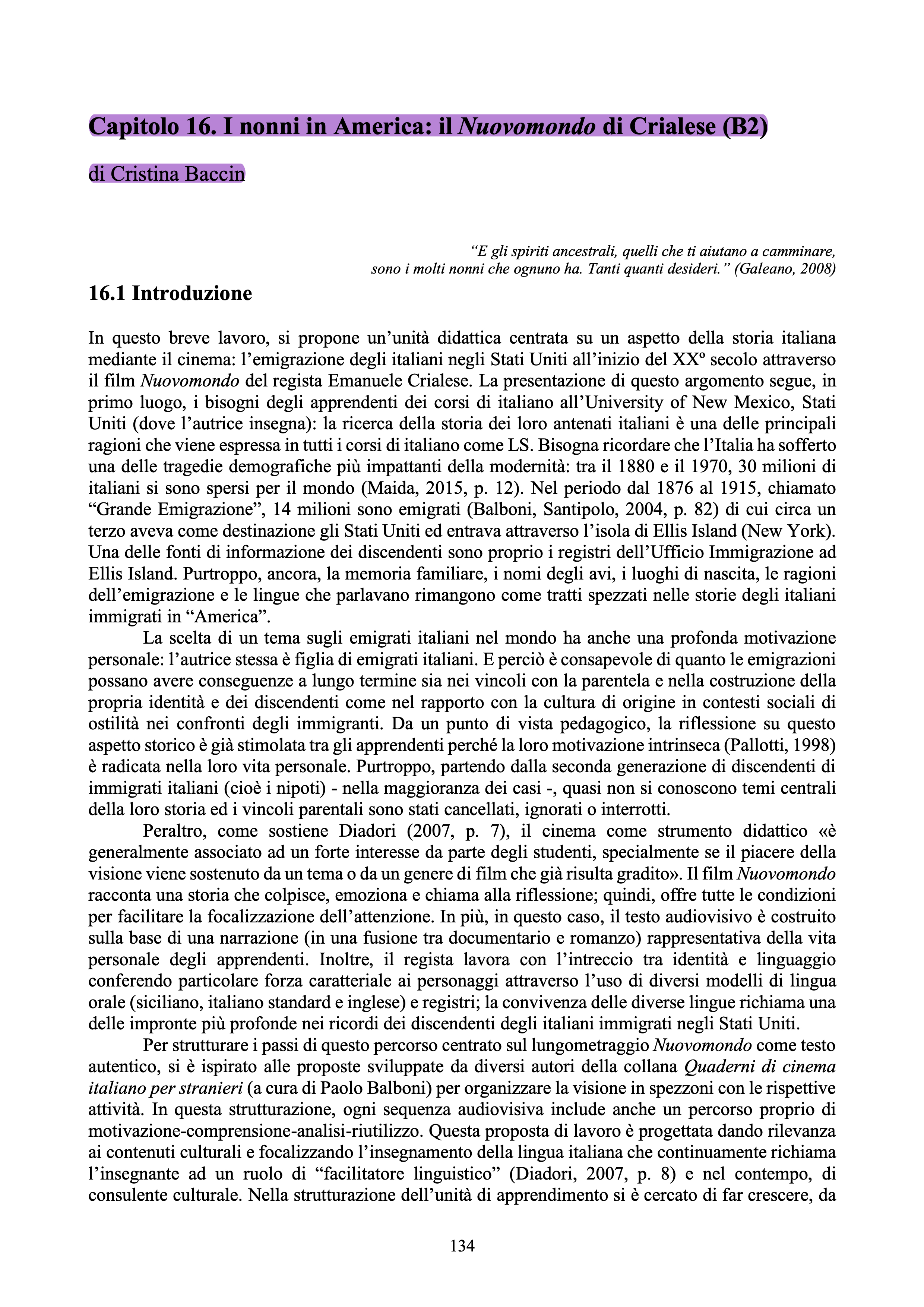 A quote of the editor: “Il Capitolo 16 presenta la storia dell’emigrazione italiana negli Stati Uniti tramite vari spezzoni di Nuovomondo di Crialese ed è destinato, in primo luogo, ad apprendenti alla ricerca della storia dei propri antenati italiani.” /// “Chapter 16 presents the history of Italian emigration to the United States through various excerpts of Nuovomondo by Crialese and it is aimed to learners who are in search of the history of their Italian ancestors.”