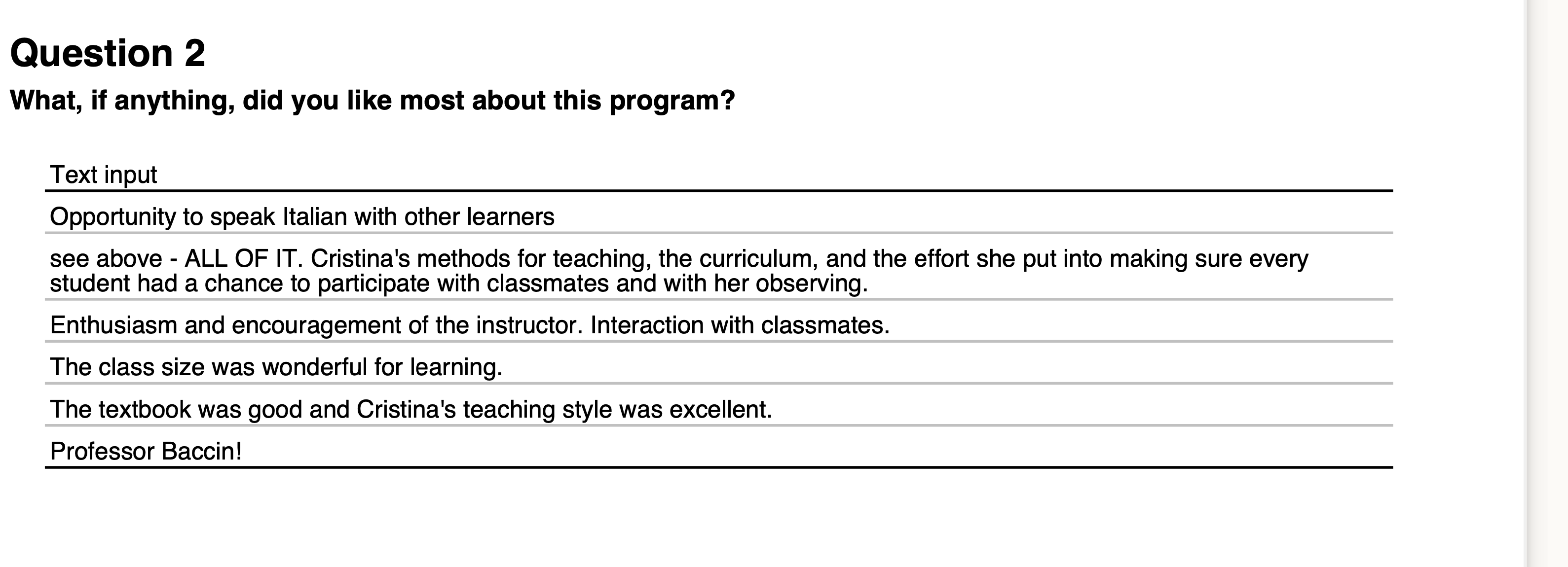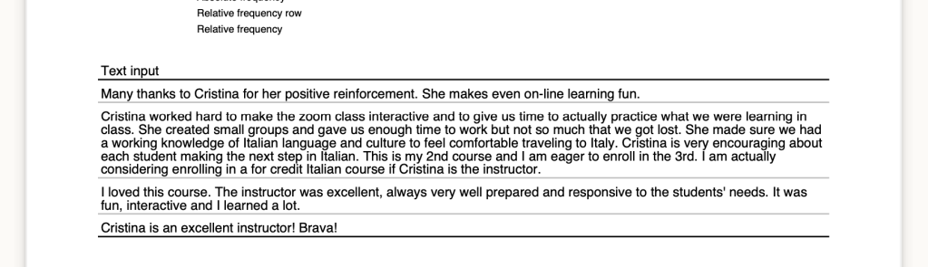 Testimonials from students – Course: Italian Beginning I LIVE ONLINE (9608-008) –(UNM Spring April-May 2022)